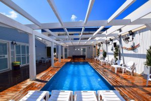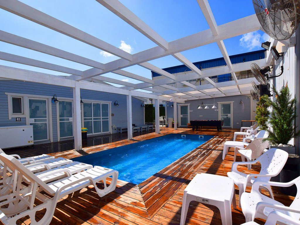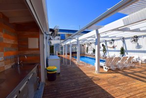 חצר מטופחת צמודה אל הלופט עם בריכה, פרגולה, תאורה רומנטית, ריהוט גן, עמדת מנגל.