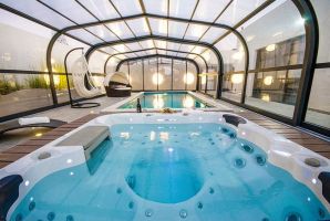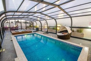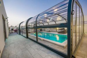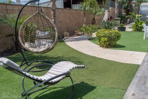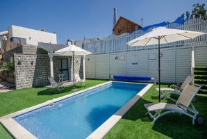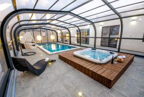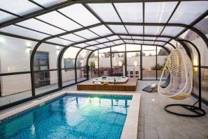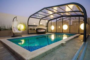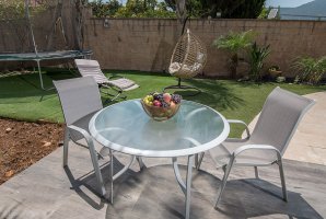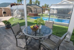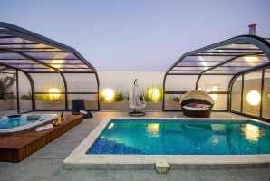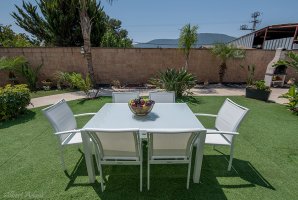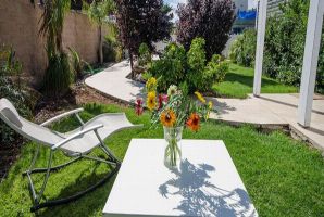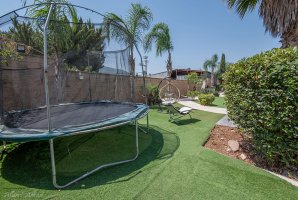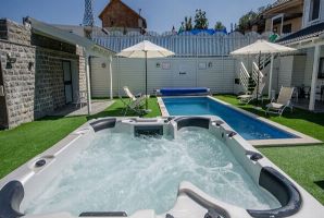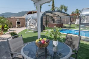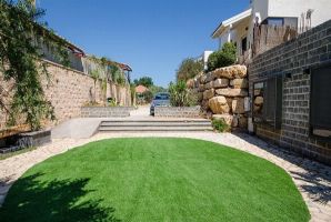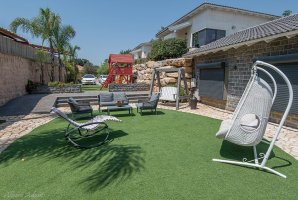 מדשאה ירוקה מטופחת מקיפה את המתחם כולו עם פינות ישיבה נוחות, פינות שיזוף, תאורת גן יפה, נדנדה, עמדת מנגל (לא בשבת), טרמפולינה, שולחן מיני ביליארד, טניס שולחן, פינת משחקים לילדים. האטרקציות המרכזיות הן בריכה פרטית מפנקת (מחוממת בעונה) מוקפת ריצוף דק וג'קוזי ספא מפנק. יש בחצר גם מסך ענק עם חיבור למערכת קולנוע ביתית.