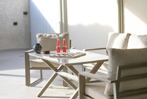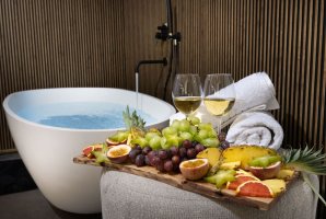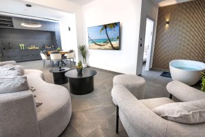 בתוך הסוויטה תגלו עיצוב יוקרתי עם כל האביזרים הנדרשים לחופשה מושלמת. מסך LCD עם פרטנר TV ושולחן אוכל נפתח להנאתכם. המטבח החיצוני מאובזר לחלוטין, וכולל מכונת אספרסו עם קפסולות, מקרר, כיריים וטוסטר אובן להכנת ארוחות מפנקות.