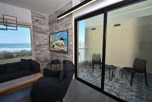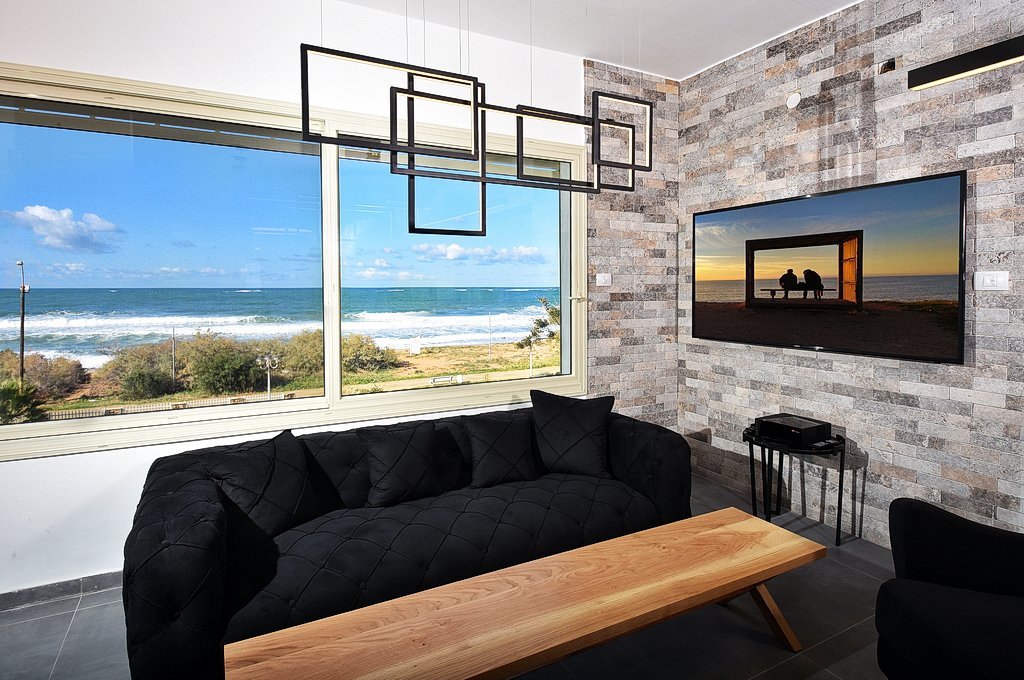 הסלון כולל פינת ישיבה נוחה, שולחן ומסך טלוויזיה גדול עם מבחר ערוצים. חלון גדול ממוקם בסלון דרכו תוכלו להשקיף ישירות על נופי הים התיכון. קולות הגלים המתנפצים אל החוף ילוו אתכם בכל שעות היום. מטבח מאובזר בכל הדרוש יאפשר לכם בישול עצמי של ארוחות במהלך האירוח.