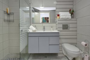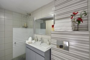 חדר הרחצה של הדירה נקי, מעוצב ומאובזר בכל הדרוש. יש בחדר הרחצה מקלחון, כיור, מראה ושירותים.