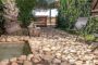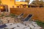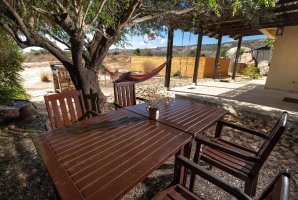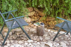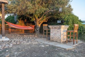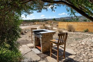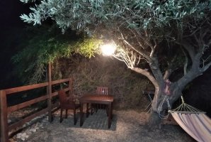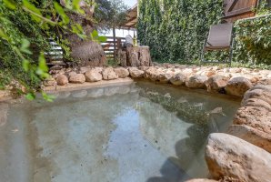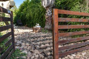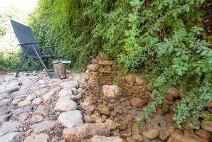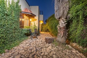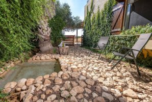 בחצר הבית, ששיטחו 180 מ"ר בקומה אחת, יש גם מספר פינות ישיבה: בזולה שמתחת לעץ הזית, מתחת לפרגולה, פינת שיזוף ליד ההוט-טאב והבריכה, פינת צפייה בטבע מול הנוף, וליד מפלון המים (הצפייה והאזנה לו נעימות ומרגיעות); כמו גם מתקן ברביקיו מבריקים שבתוכו ציוד מקצועי מנירוסטה ומסביבו כסאות בר מעץ ("לעשות על האש" או לשתות בירה ליד המתקן מול הנוף), שני ערסלים ונדנדה. מהגג הגדול - שבו כסאות נוח, שולחן, פינת דשא ושימשיות - נשקף נוף 360 מעלות עוד יותר יפה. למעוניינים לראות ולשמוע את פלג המים, נא חפשו ביוטיוב "סרטון פלג המים בבית כפרי הגובל בטבע".