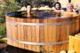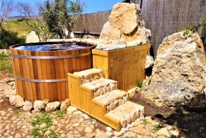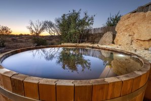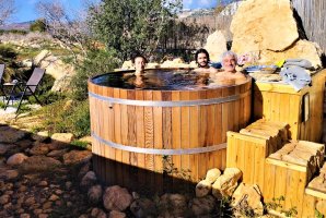 באשר להוט-טאב: הוא בנוי מעץ Cedar אדום בעל ריח נעים וריכוז גבוה במיוחד של שמנים אתריים. עקב הפרשת שמנים אלו למי ההוט-טאב הרחצה בו היא חוויה מיוחדת, ריחנית ומרגיעה, שגם מטפחת את עורם של המתרחצים. טמפרטורת המים היא בד"כ 40 מעלות (לבקשת האורחים ניתן להוריד את הטמפרטורה); יש בהוט-טאב גם ג'טים אויר-מים של ג'קוזי.