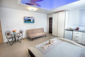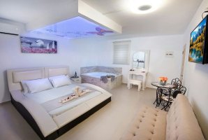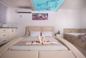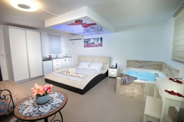 בכל סוויטה בווילה תמצאו ג'קוזי זרמים מפנק, חדר רחצה, מטבחון, פינת אוכל קטנה, פינת סלון ומסך טלוויזיה עם ממיר כבלים. הלינה היא במיטה זוגית עם מזרן אורתופדי נוח. הספה בסלון נפתחת למיטה נוספת.