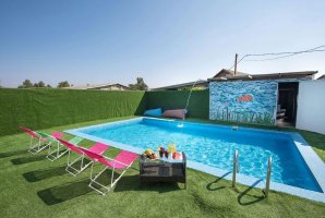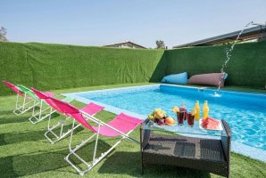 חצר נופש מהנה צמודה אל הווילה עם בריכה פרטית, מיטות שיזוף, פינת ישיבה, ערסלים, מדשאה ירוקה, עצים ופרחים, תאורת גן ומתחם גדול שמתאים לבילוי משפחתי או קבוצתי.