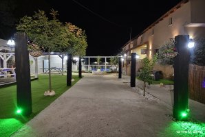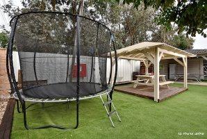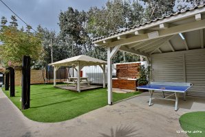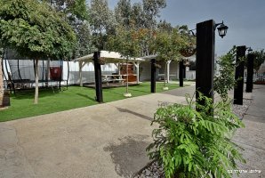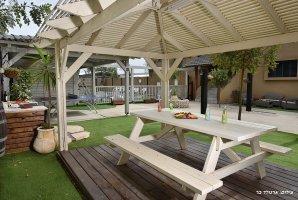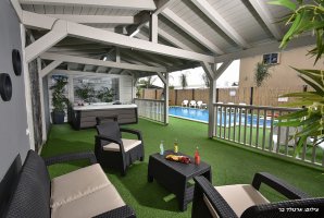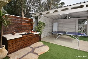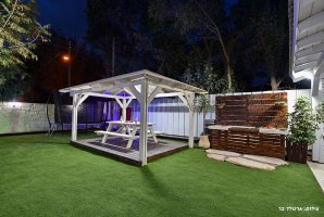 ריהוט גן יוקרתי, נדנדה, ערסל. יש בחצר משחקים לילדים : טרמפולינה ומשחקי שולחן. קיים גם שולחן פינג פונג חדש. תאורת גן תאפשר שימוש בחצר גם בשעות הערב. תוכלו לצפות בסרטים או בחדשות בעזרת מקרן ומסך נפתח גם כן בחצר.