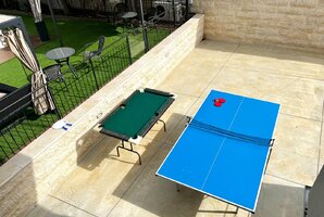 המתחם החיצוני מצויד במטבח מאובזר, פינות ישיבה נעימות, עמדת מנגל BBQ, ומגרש כדורסל להנאה מושלמת. במתחם החיצוני גם תמצאו מיטות שיזוף וערסלי, לרוגע ושלווה בחופשה שלכם.