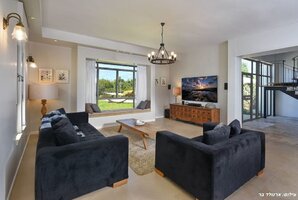 הסלון היוקרתי של הווילה כולל פינת ישיבה נוחה, מסך גדול 55 אינטש, ממיר יס ומערכת קולנוע ביתית. חובבי שלחנות משחק ישמחו למצוא שולחן פינג פונג ועמדת כדורסל. האירוח כולל סלסלת שוקולדים ופירות העונה.