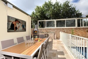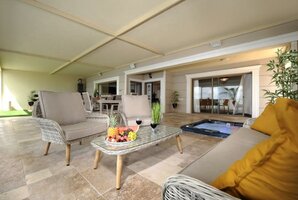 המתחם החיצוני של האחוזה כולל פינות ישיבה מעוצבות, מיטות שיזוף נוחות, עמדת מנגל BBQ ושולחן פינג פונג להנאה משפחתית או זוגית. המטבח החיצוני המאובזר מבטיח את כל מה שצריך כדי להפוך כל ארוחה לחגיגה.