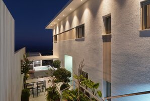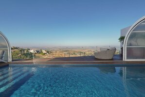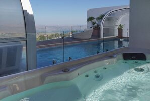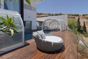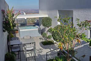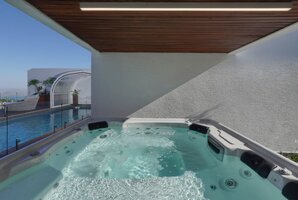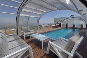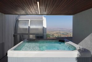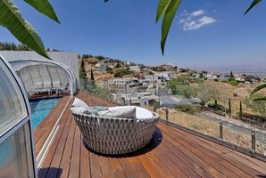 רחבה חיצונית מושקעת מוקפת חומות גבוהות לפרטיות מלאה במתחם. החנייה ממוקמת לצד הווילה ויש בה מערכת מצלמות. אתם מוזמנים לבלות וליהנות עם בריכה מחוממת ומקורה לפי העונה, ג'קוזי ספא מפנק אל מול הנוף, מטבח גן לצד עמדת הגריל, פינות ישיבה נוחות. סביב הבריכה מותקנת גדר בטיחות לילדים. האירוח ללא מערכת הגברה או רמקולים במתחם.
