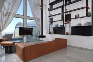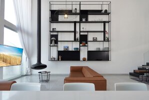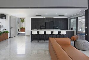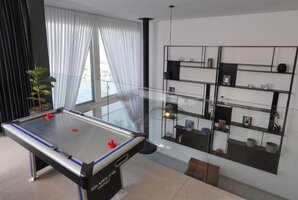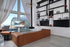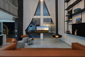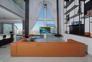 פינת ישיבה יוקרתית גדולה מוצבת אל מול קיר זכוכית המשקיף אל הבריכה בחצר ואל הנוף. מסך טלוויזיה 60 אינטש כולל ממיר הוט עם מבחר ערוצים. מערכת מיזוג אוויר חדישה ואיכותית ממזגת את המתחם כולו.