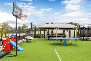 הוילה כוללת 6 חדרי שינה מרווחים ו-8 מקלחות ושירותים, המבטיחים נוחות מקסימלית לכל אורח. במתחם תמצאו בריכת שחייה פרטית, מגודרת, מקורה ומחוממת, שמזמינה אתכם לטבול בה בכל עונה. בנוסף, תוכלו ליהנות ממגוון אטרקציות חיצוניות כמו מגרש כדורסל, שולחן סנוקר חיצוני ועמדת מנגל BBQ.