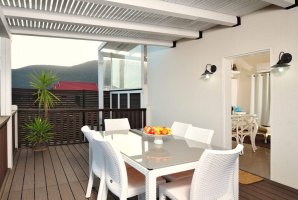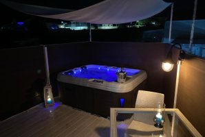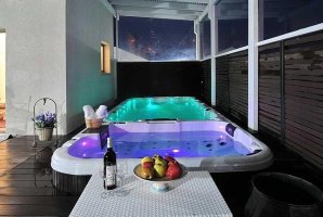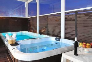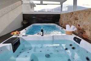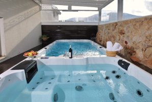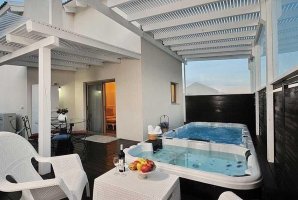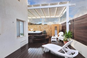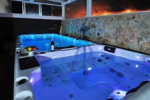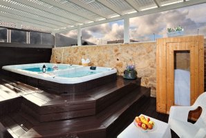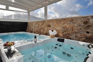 במתחם החיצוני תוכלו ליהנות מבריכת שחייה פרטית מקורה, מחוממת ומגודרת, יחד עם בריכת זרמים מרעננת. סביב הבריכה ישנן פינות ישיבה וריהוט גן חיצוני המאפשרים לכם להירגע וליהנות מהנוף.