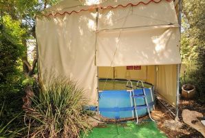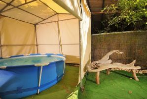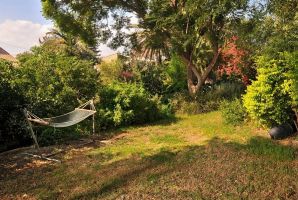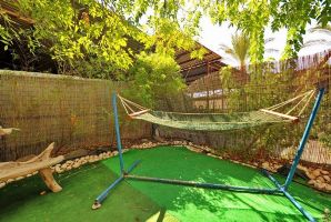 חצר ירוקה ומטופחת מקיפה את המתחם ומציעה פינות ישיבה, בריכה לילדים, ערסלים, עמדת מנגל, תאורת גן רומנטית, גינה מטופחת עם עצים, פרחים וצמחי תבלין.