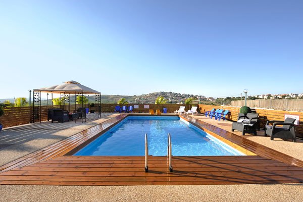 את 3 בקתות העץ במתחם מקיפה חצר נופש מטופחת עם בריכה פרטית (מגודרת) מחוממת / מרעננת בהתאם לעונה. לצד הבריכה תמצאו פינות ישיבה נוחות, מיטות שיזוף, שולחן גינה וגם ערסל. עבור הילדים יש מתקני חצר לקטנטנים. חובבי ספורט ישמחו למצוא מגרש כדורסל ושולחן פינג פונג. בזמן הבילוי בבריכה אתם מוזמנים לצלות בשרים בעמדת המנגל.