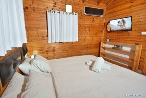 הבקתות מעוצבות בסגנון יוקרתי כפרי עם קירות עץ מלא, התוצאה היא בקתה רומנטית עם חמימות משפחתית קסומה, אווירה של בקתת יער סודית קסומה. בתוך הבקתה תמצאו מטבחון מאובזר להכנת ארוחות קלות, לא שכחנו להוסיף גם מכונת אספרסו וקפסולות. הלינה היא במיטה זוגית רכה ונוחה אותה תמצאו מסודרת עם מצעים נקיים וכלי מיטה רכים. החלונות בבקתות כולם מכוסים וילונות בד המאפשר חדירה של אור אל החדר תוך שמירה על פרטיות מלאה. מערכת מיזוג אוויר תדאג לכך שתהיה בבקתה טמפרטורה נעימה על פי בחירה שלכם לנוחות מקסימלית.
