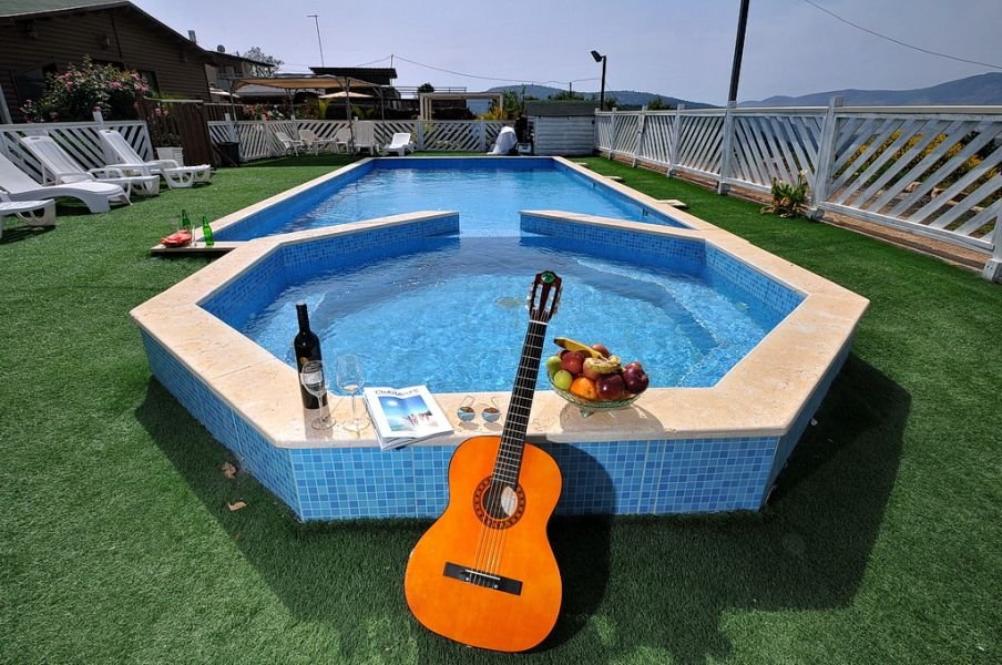 בריכה פרטית מרעננת עם בריכה נוספת בצורת משושה עם ספסלי ישיבה ממתינות לכם בחצר אל מול הנוף. סביב הבריכה מיטות שיזוף, ערסל, ריהוט גן, גינה מטופחת, שולחן כדורגל, שולחן פינג פונג ועמדת ברביקיו מאובזרת. כעת לאחר שבילינו בבריכה זה הזמן להיכנס את תוך הצימרים.