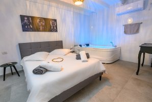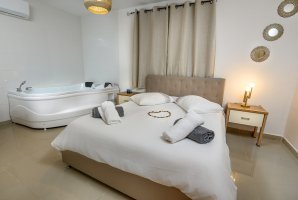 חופשה בצימר מטופח ומושקע עם אמבט ספא זוגי ליד המיטה, חצר נופש מטופחת, בריכה פרטית, עיצוב יוקרתי, אווירה כפרית ושפע של אפשרויות לטייל ולבלות באזור.