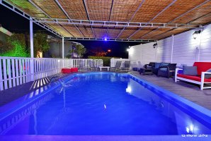 בחצר הצימרים במתחם המשותף צמחייה ירוקה, תאורה רומנטית בשעות הערב, ריהוט גן מפואר, בריכה מחוממת ומקורה בהתאם לעונה ופינת ברביקיו. שימו לב, לכל צימר מרפסת פרטית עם פינת ישיבה ופינת מנגל.