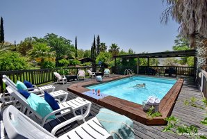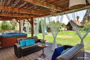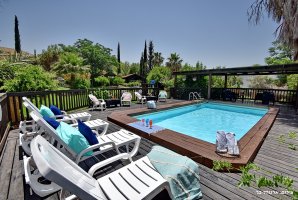 חצר הנופש של המתחם כוללת בריכה מהנה מוקפת ריצוף דק עץ יוקרתי. גדר מקיפה את הבריכה. תשמחו לגלות בחצר גם ג'קוזי מרובע, פינות ישיבה, מדשאות, ערסלים, תאורת גן. אורחי המתחם נהנים גם מסאונה חמה.