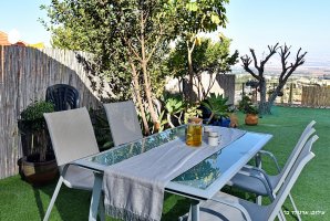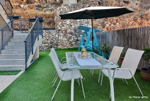 המתחם החיצוני כולל פינת ישיבה נוחה, שולחן גינה, עמדת מנגל ונוף מרהיב. נפתח את היום במרפסת עם ארוחת בוקר כפרית ונסיים אותו עם כוס יין אל מול הנוף.