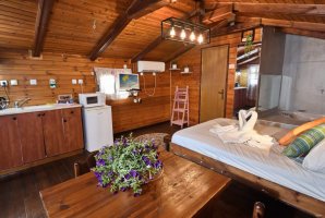 בכל בקתה תמצאו עיצוב פנים מרהיב הכולל רצפת פרקט, ספת סלון נפתחת למיטה, מסך LCD עם HOT ו-Netflix, ושולחן אוכל מעוצב. המטבח מאובזר בקומקום חשמלי, מקרר, כיריים ומיקרוגל, כך שתוכלו להכין ארוחות בקלות.