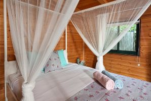 בכל צימר במתחם תמצאו מיטה זוגית מפנקת עם כילה רומנטית וכלי מיטה איכותיים.
